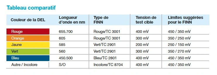 Le détecteur Mega FINN™ est également très performant pour les LEDs clignotantes (à 50 Hz ou plus) et d’intensité élevée à très faible. Il détermine la couleur et l’intensité de la LED testée, la convertissant en un signal aisément lisible qui permet de comparer les LEDs et d’autres sources lumineuses. Le Mega FINN™ indique une fréquence en kHz qui qualifie la couleur de la LED, le même signal quantifie l’intensité de la LED en mesurant sa largeur d’impulsion (tension moyenne du courant continu).