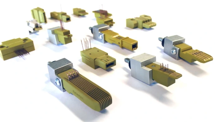 Ces connecteurs peuvent très facilement être montés dans les bancs et modules de test. Le contact du composant à tester peut ainsi se faire au choix à travers la course du banc ou module ou en intégrant les connecteurs dans une unité commandée pneumatiquement.