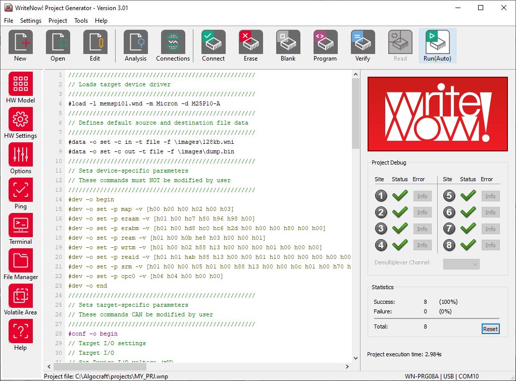 La série WriteNow! de programmeurs en circuit peut être contrôlée par un PC hôte via des chaînes ASCII simples, à travers une interface terminal standard. En plus de cela, une interface utilisateur puissante est fournie, permettant de configurer et de contrôler les instruments grâce à des procédures graphiques simples. Le WriteNow! Project Generator vous guide tout au long de la création et du débogage d'un projet de programmation en quelques étapes guidées : sélection du dispositif, création du fichier source, paramètres de la carte, options de flux de programmation, téléchargement et exécution du projet.